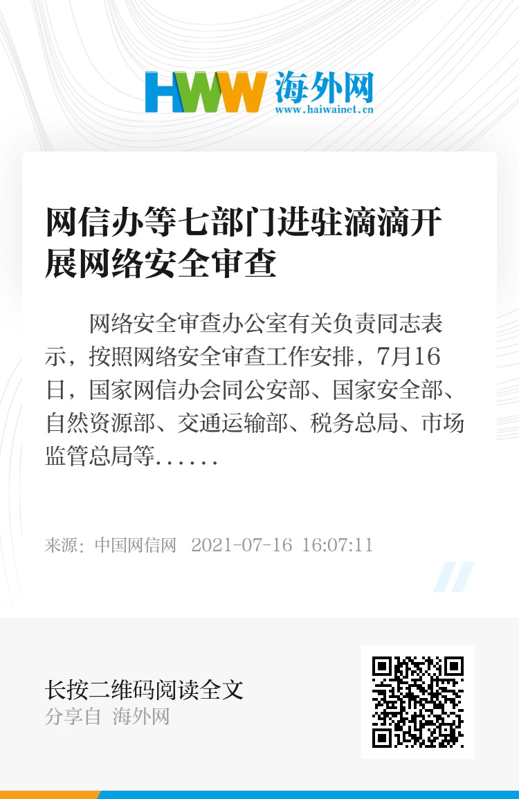 网络安全审查办公室有关负责同志表示,按照网络安全审查工作安排,7月16日,国家网信办会同公安部、国家安全部、自然资源部、交通运输部、税务总局、市场监管总局等部门联合进驻滴滴出行科技有限公司,开展网络安全审查。
