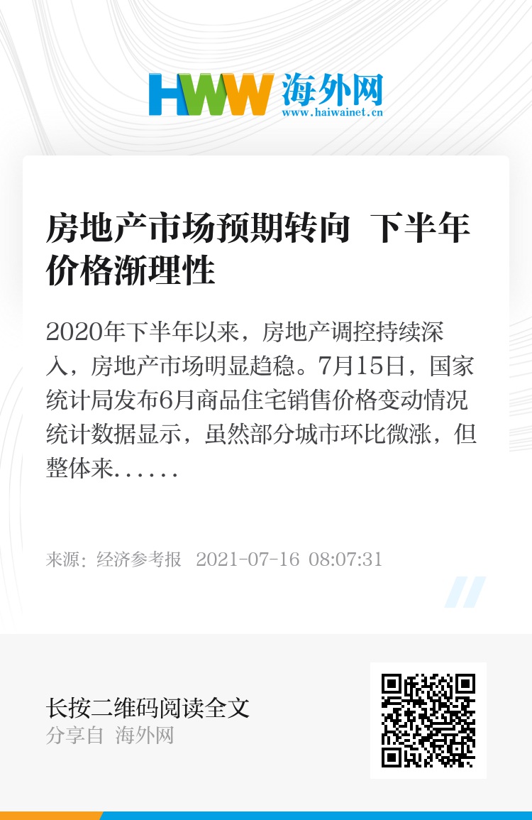 2020年下半年以来,房地产调控持续深入,房地产市场明显趋稳。7月15日,国家统计局发布6月商品住宅销售价格变动情况统计数据显示,虽然部分城市环比微涨,但整体来看,70个大中城市商品住宅销售价格涨幅已呈现稳中有落的态势。其中,二手住房管控效果更为明显。业内人士表示,调控下多方预期已有转向迹象,2021年下半年,随着信贷政策继续收紧,未来房价涨幅有望进一步放缓,楼市将进入新一阶段调整。