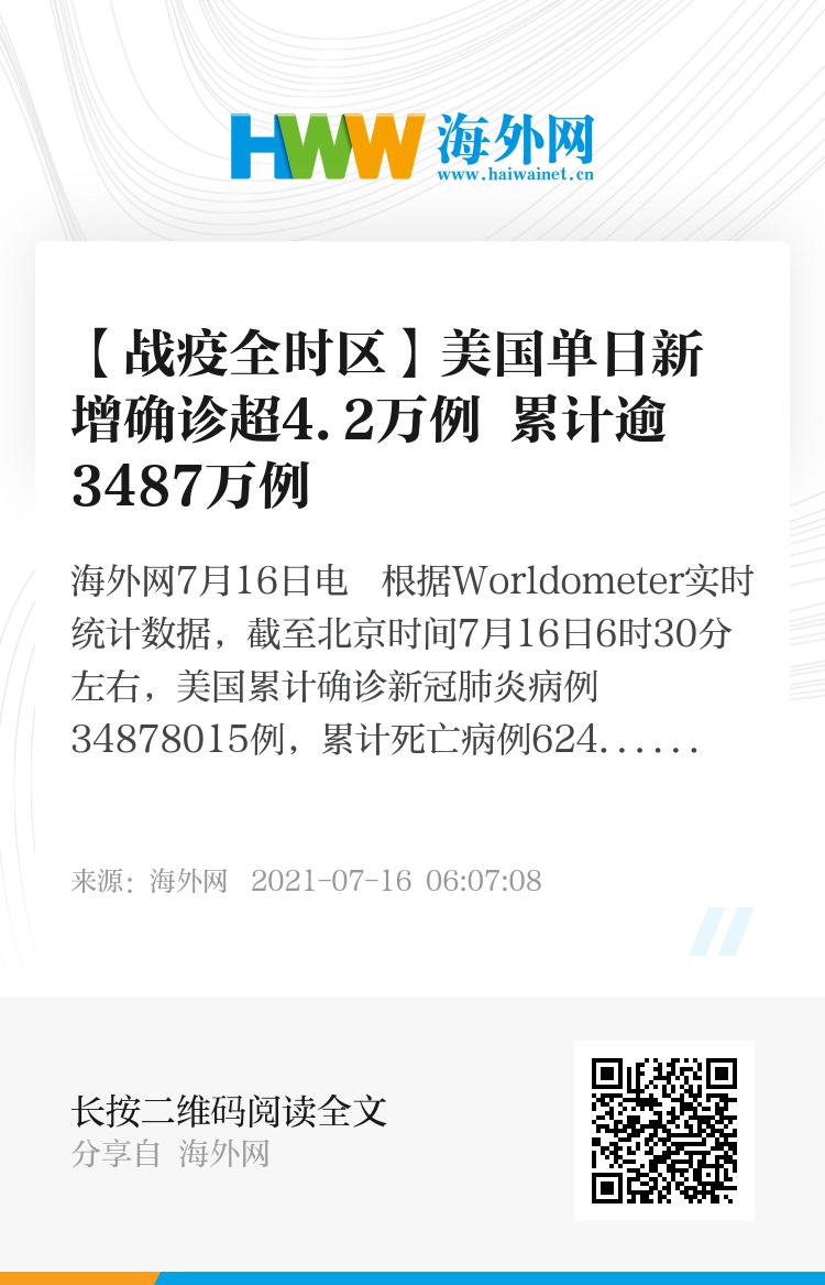 海外网7月16日电 根据Worldometer实时统计数据,截至北京时间7月16日6时30分左右,美国累计确诊新冠肺炎病例34878015例,累计死亡病例624147例。与前一日6时30分数据相比,美国新增确诊病例42348例,新增死亡病例423例。(海外网 姚凯红)