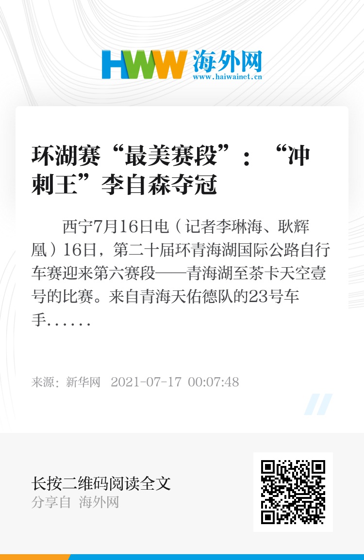 新华社西宁7月16日电(记者李琳海、耿辉凰)16日,第二十届环青海湖国际公路自行车赛迎来第六赛段——青海湖至茶卡天空壹号的比赛。来自青海天佑德队的23号车手李自森夺得赛段冠军,并继续保有代表个人冲刺积分第一名的绿衫。