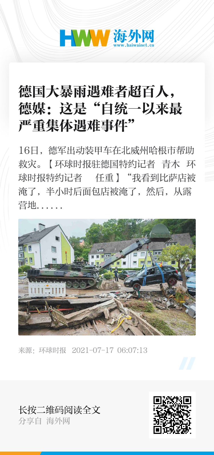 【环球时报驻德国特约记者 青木 环球时报特约记者 任重】“我看到比萨店被淹了,半小时后面包店被淹了,然后,从露营地的方向随水流漂过来大篷车和油箱,”在德国舒尔德地区住了60年的克劳斯拉德马赫向路透社描述15日这场突如其来的洪灾,“我们无力抵抗。它来得太快了,我从未见过这种场面。”德国电视一台16日称,截至当地时间16日傍晚18时,此次洪灾造成德国死亡人数已增至106人,另有约1300人失踪,并称这是“自德国统一以来最严重的集体遇难事件”。当地时间15日正在华盛顿访问的德国总理默克尔表示,这一天“充满恐惧、绝望、痛苦”,而她的心“与灾民同在”。媒体大多把此次洪灾的原因归结为“气候变暖”,家住科隆的工程师马库斯16日则对《环球时报》记者表示,过去德国的抗灾能力“被夸大”, 此次洪灾充分说明“德国的基础设施该更新了”。