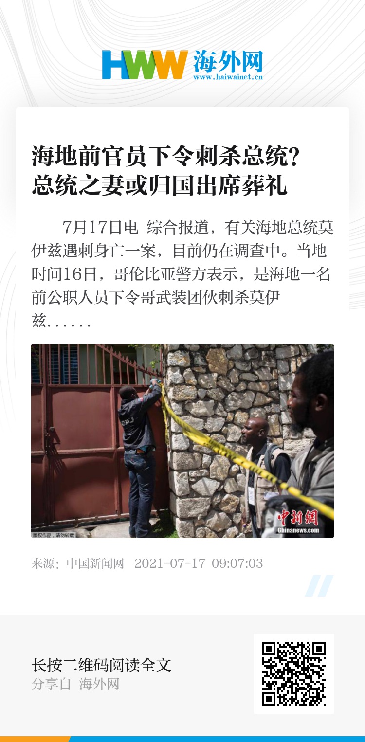 据报道,莫伊兹7日凌晨在家中遇刺身亡,第一夫人玛蒂娜当时也受了重伤,目前在美国接受治疗。