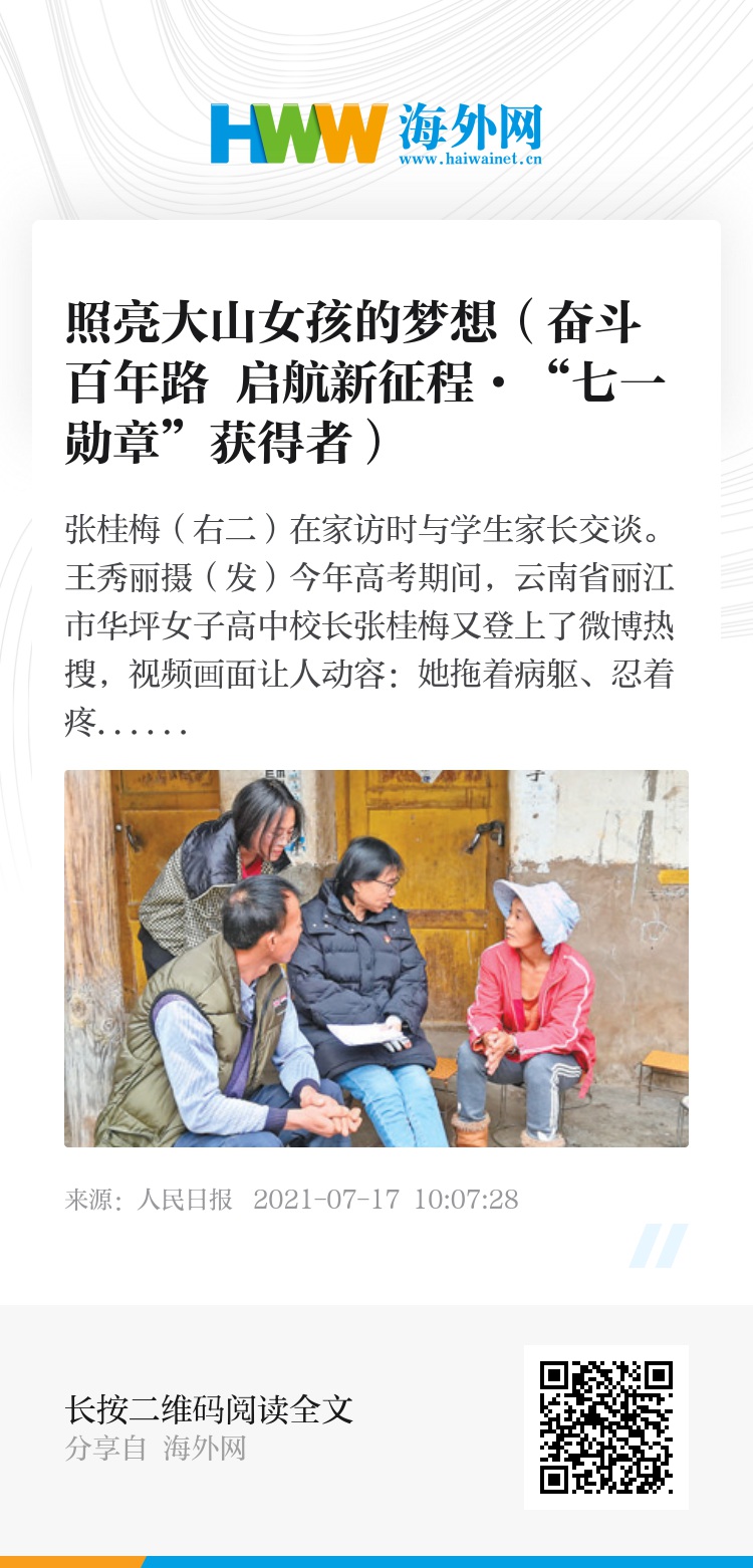 “七一勋章”“全国脱贫攻坚楷模”“全国优秀共产党员”“全国先进工作者”“时代楷模”……对于荣誉,张桂梅很淡然,她说:“我就是个山村女教师,还是个老党员,事情不是我一个人做的。”