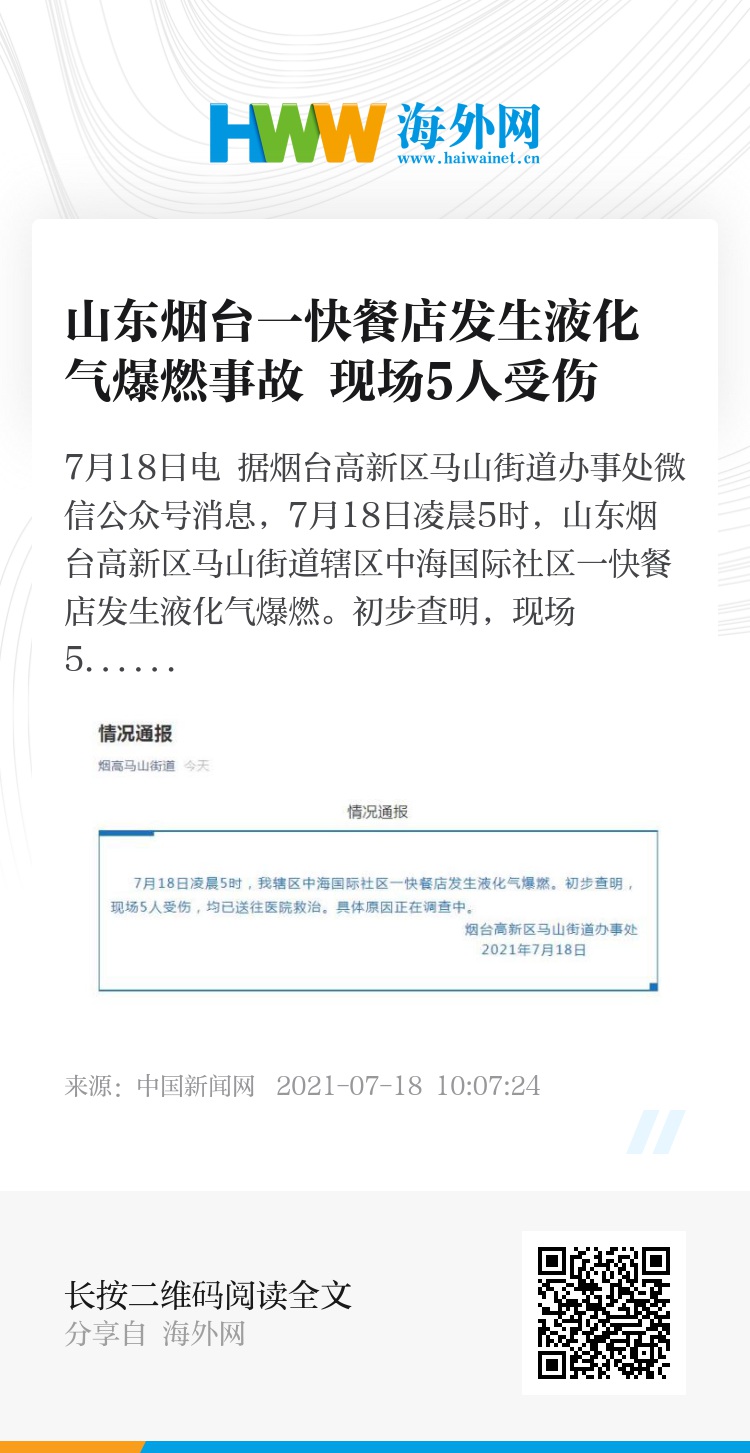 中新网7月18日电 据烟台高新区马山街道办事处微信公众号消息,7月18日凌晨5时,山东烟台高新区马山街道辖区中海国际社区一快餐店发生液化气爆燃。初步查明,现场5人受伤,均已送往医院救治。具体原因正在调查中。