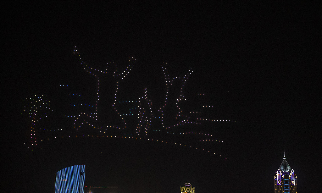 海口万绿园上空上演无人机表演秀 表白海南自贸港