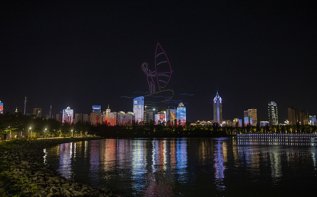 2021年7月16日晚,随着“海南奋进 世界共享”——2021海南自由贸易港建设总体方案发布一周年全媒体海南行暨交流推介活动正式启动,一场无人机表演秀点亮海口万绿园夜空,520架无人机以夜空为幕布,上演一场不一样的“爱的告白”。图源:视觉中国