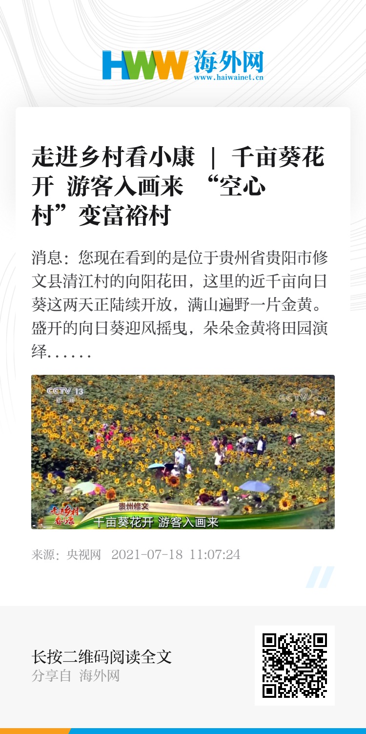 清江村原来以种植蔬菜为主,今年年初,村里利用闲置土地种植向日葵,靓丽的风景吸引了很多游客前来打卡赏花,旅游门票、农家乐、葵花籽榨油等各项加起来,预计今年就能带来42万元左右的创收,成为当地群众增收致富的新门路。