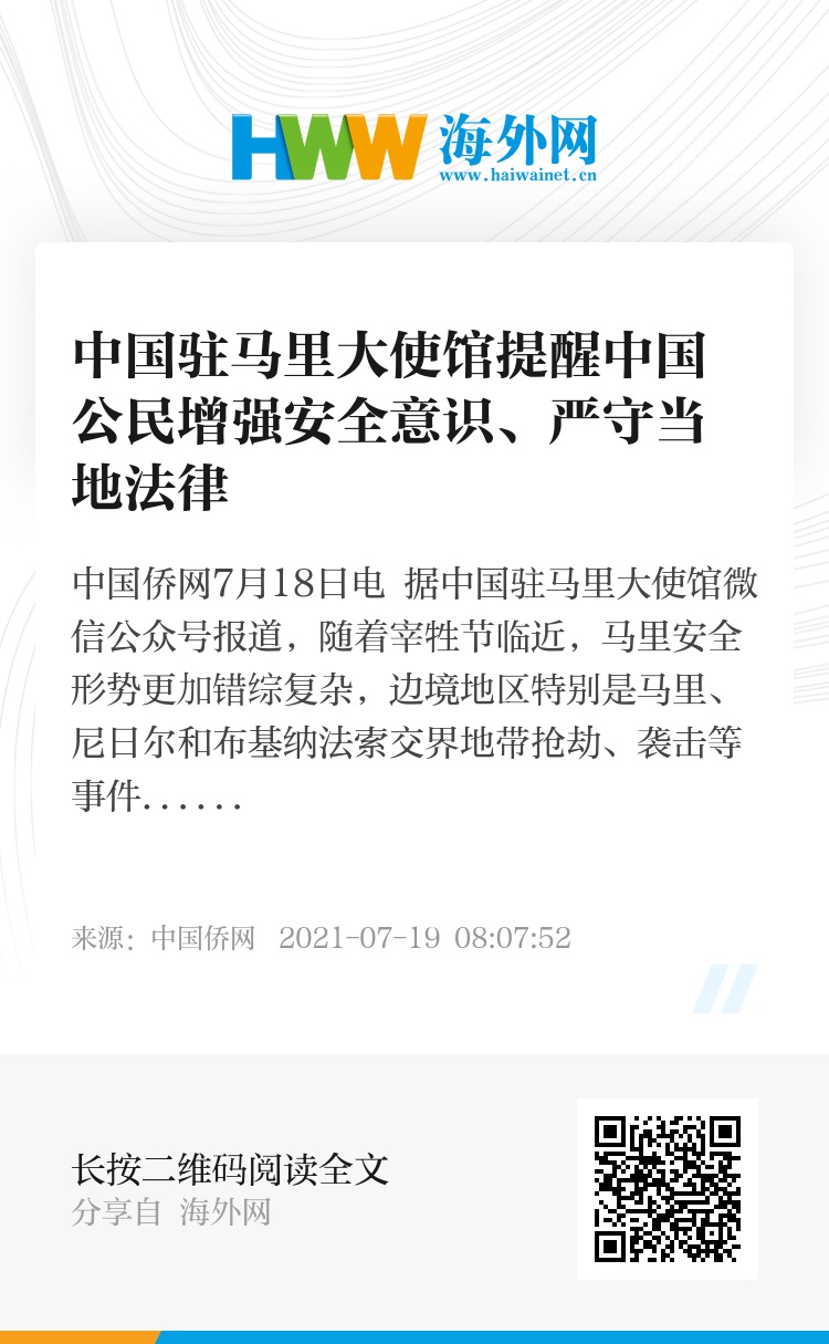 中国驻马里大使馆提醒在马侨民和企业进一步增强安全意识和底线思维,严格遵守当地法律法规和风俗习惯,做好安全和疫情双重防护,确保人身和财产安全。如遇紧急情况,请在确保自身安全的情况下及时报警并联系使馆寻求协助。