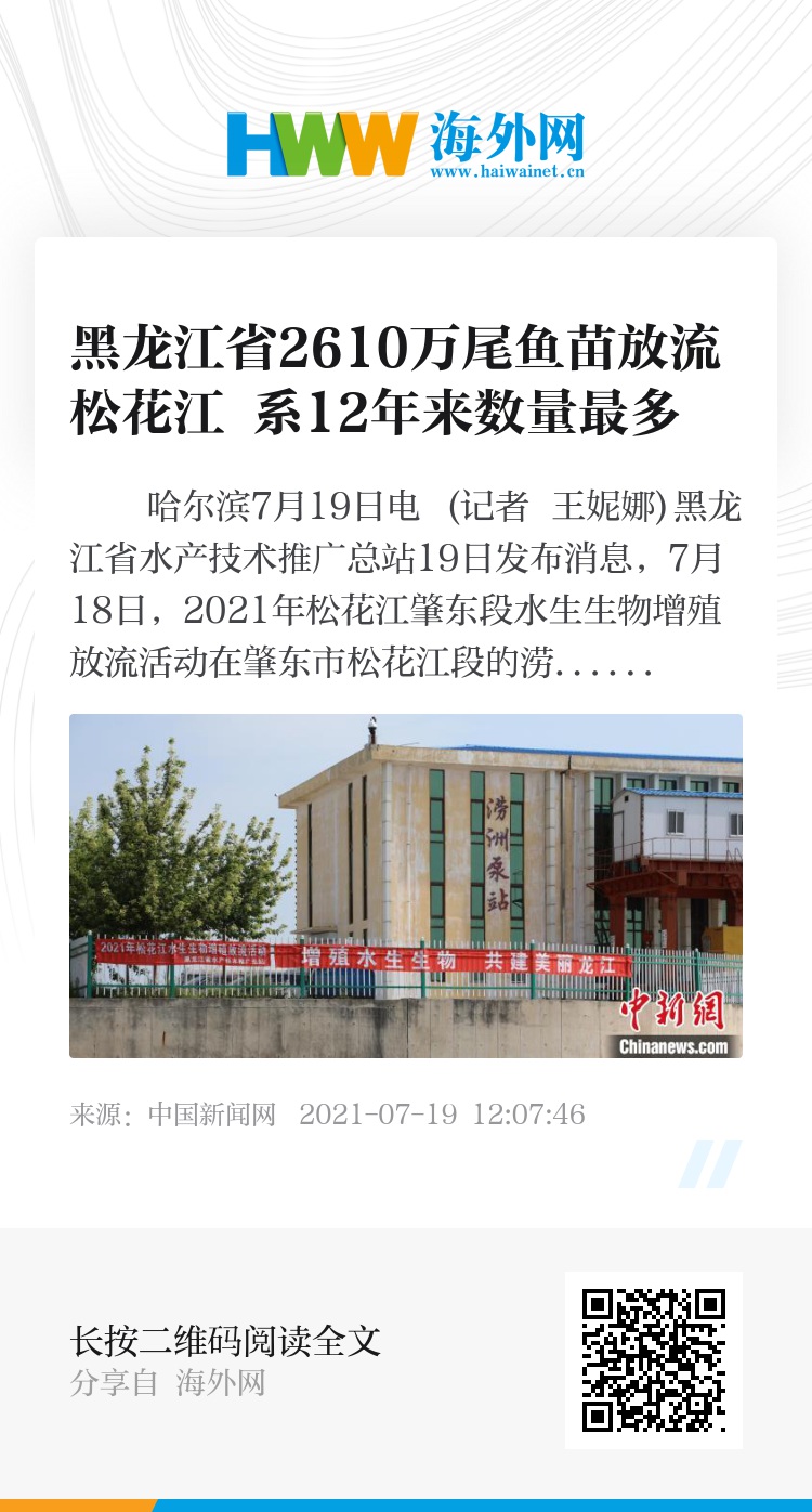 中新网哈尔滨7月19日电 (记者 王妮娜)黑龙江省水产技术推广总站19日发布消息,7月18日,2021年松花江肇东段水生生物增殖放流活动在肇东市松花江段的涝洲泵站举行,2610万尾鱼苗放流进入松花江,这是最近12年以来,松花江段放流鱼苗单次数量最多的一年。