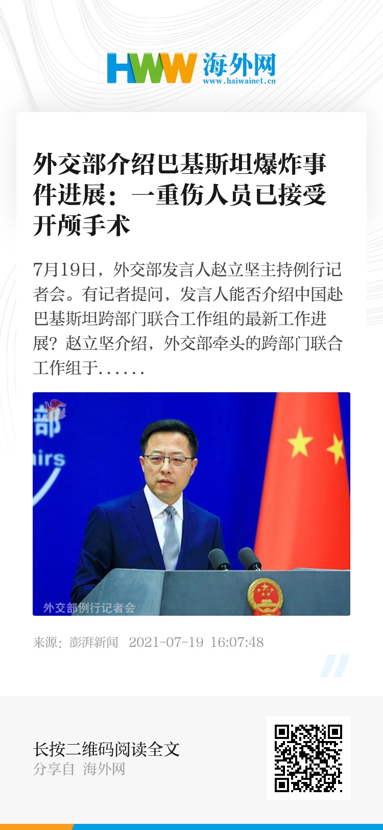 赵立坚介绍,外交部牵头的跨部门联合工作组于16日凌晨抵达伊斯兰堡,几天以来,工作组马不停蹄开展工作,同驻巴大使一道全面做工作,推动巴方救治伤员,彻查事件,加大对中方项目人员安保,并连同巴方高层看望伤员,吊唁遇难同胞,赴现场勘查,慰问营地员工等,现场指导企业加强安全防范,工作成效显著。