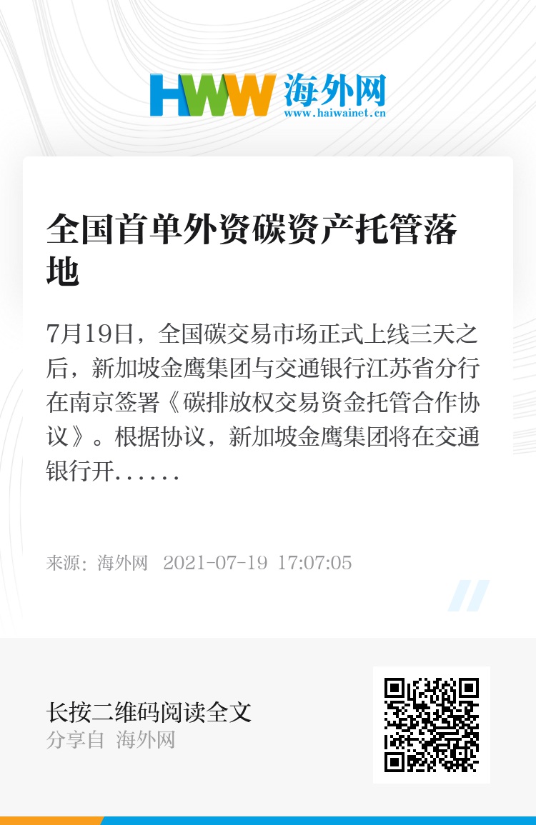7月19日,全国碳交易市场正式上线三天之后,新加坡金鹰集团与交通银行江苏省分行在南京签署《碳排放权交易资金托管合作协议》。根据协议,新加坡金鹰集团将在交通银行开立碳排放权交易结算资金专用账户,用于集团在中国区内所有与碳交易相关的交易结算业务,并将该账户委托给交通银行进行监督及保管。该协议的签署将充分发挥碳交易在金融资本与实体经济之间的关联及赋能作用。