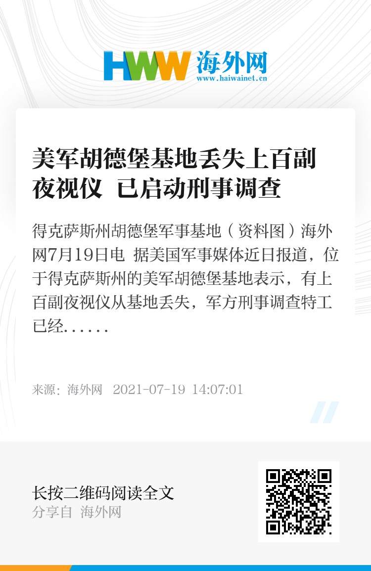 美国《军事时报》消息称,驻扎在胡德堡基地的美国陆军第3军一位发言人称,事件报告于7月12日,丢失的夜视仪都来自基地内的一处装备维修设施,相关调查已经开始,“丢失的装备对于军事准备没有直接影响”。