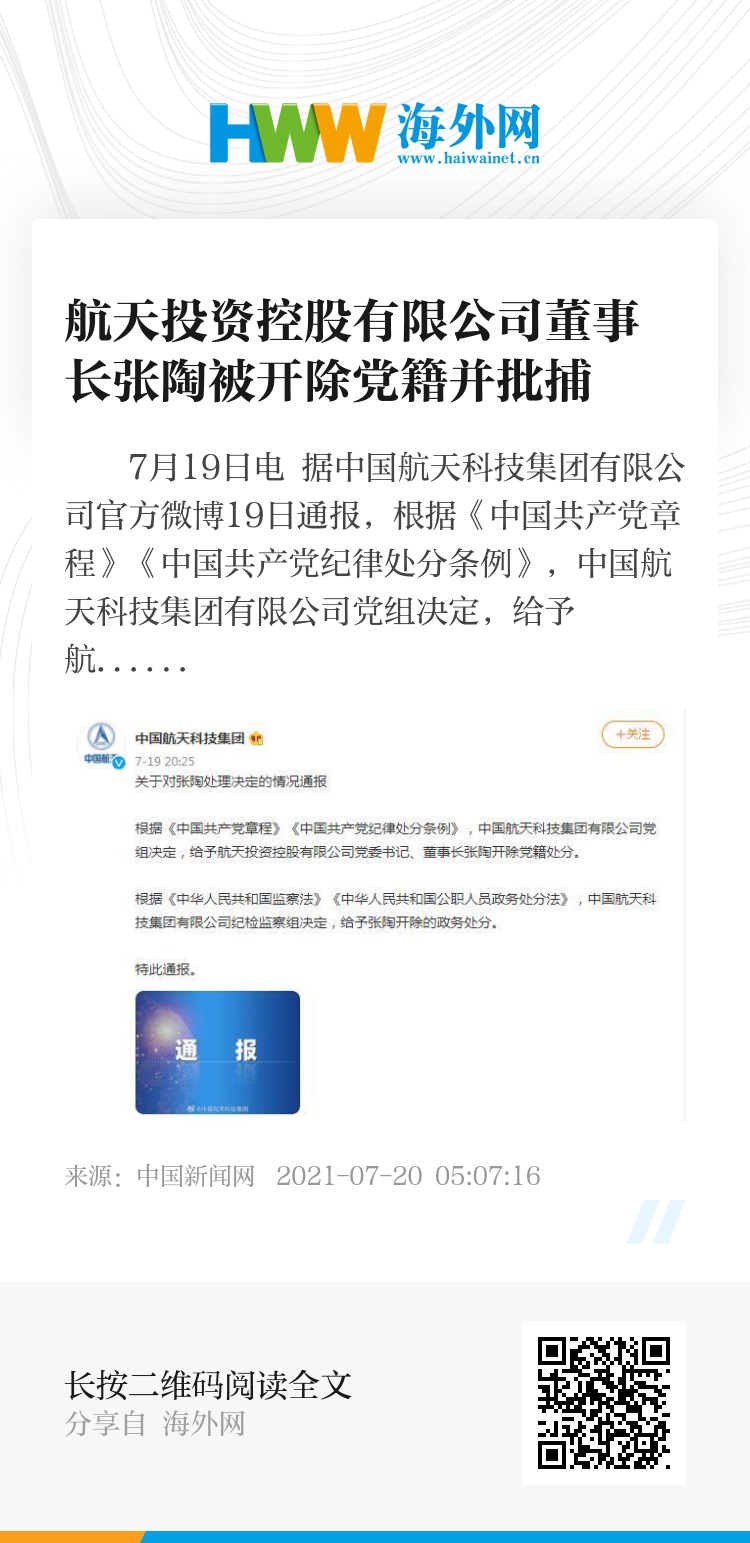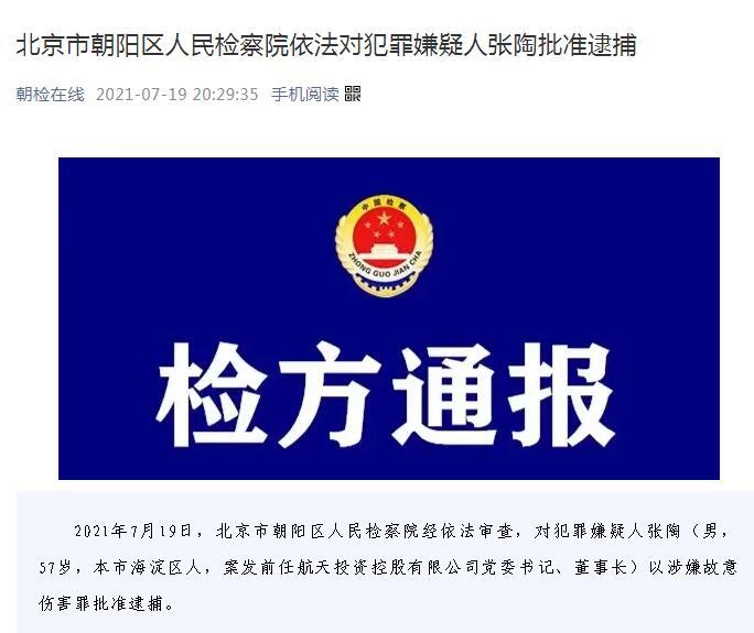 另据北京市朝阳区人民检察院官方微信消息,7月19日,北京市朝阳区人民检察院经依法审查,对犯罪嫌疑人张陶(男,57岁,本市海淀区人,案发前任航天投资控股有限公司党委书记、董事长)以涉嫌故意伤害罪批准逮捕。