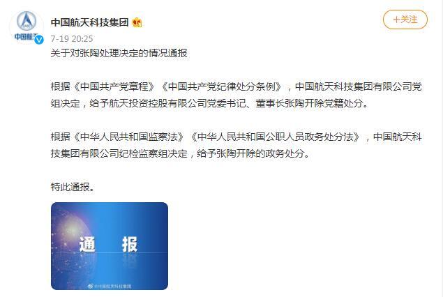 中新网7月19日电 据中国航天科技集团有限公司官方微博19日通报,根据《中国共产党章程》《中国共产党纪律处分条例》,中国航天科技集团有限公司党组决定,给予航天投资控股有限公司党委书记、董事长张陶开除党籍处分。根据《中华人民共和国监察法》《中华人民共和国公职人员政务处分法》,中国航天科技集团有限公司纪检监察组决定,给予张陶开除的政务处分。