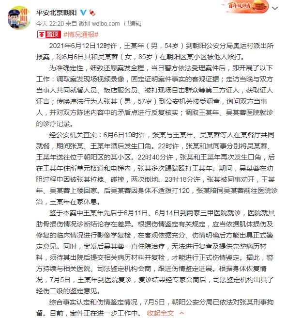 7月5日,北京市公安局朝阳分局曾发布“张某殴打两人事件”情况通报称,2021年6月12日12时许,王某年(男,54岁)到朝阳公安分局奥运村派出所报案,称6月6日其和吴某蓉(女,85岁)在朝阳区某小区被他人殴打。
