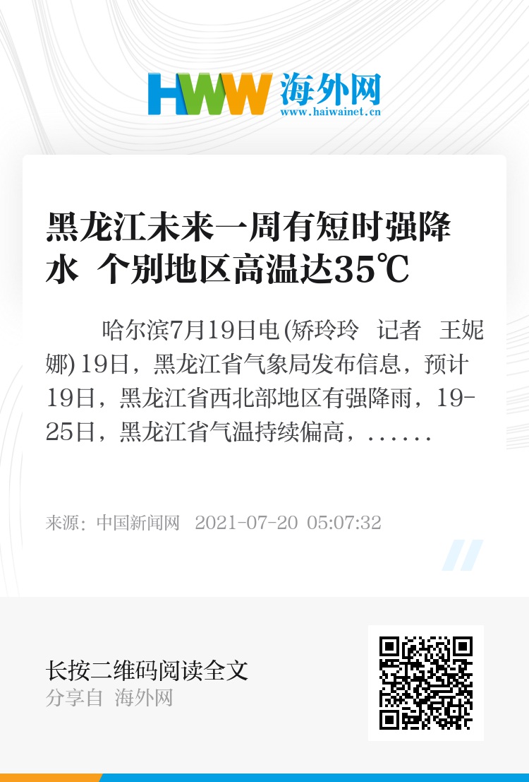 同时,未来一周(19-25日),黑龙江省大部地区持续高温,最高气温在31~33℃,23-25日东部部分地区可达35℃。(完)