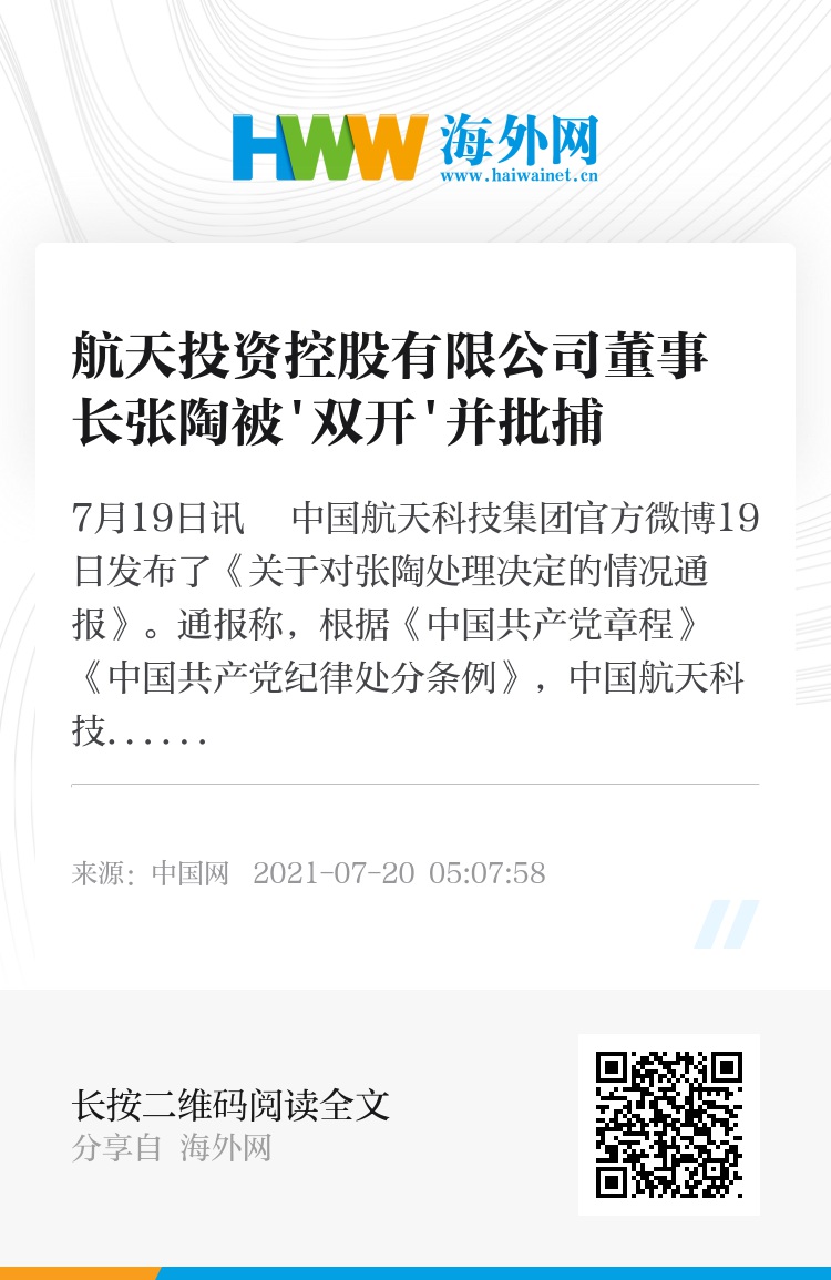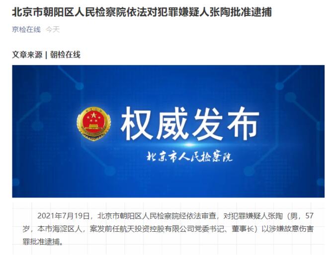 另据京检在线微信公众号消息,2021年7月19日,北京市朝阳区人民检察院经依法审查,对犯罪嫌疑人张陶(男,57岁,本市海淀区人,案发前任航天投资控股有限公司党委书记、董事长)以涉嫌故意伤害罪批准逮捕。
