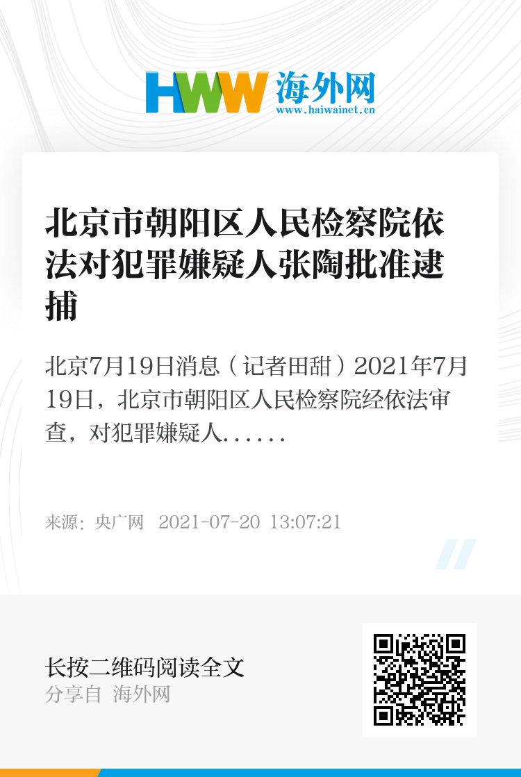 央广网北京7月19日消息(记者田甜)2021年7月19日,北京市朝阳区人民检察院经依法审查,对犯罪嫌疑人张陶(男,57岁,北京市海淀区人,案发前任航天投资控股有限公司党委书记、董事长)以涉嫌故意伤害罪批准逮捕。