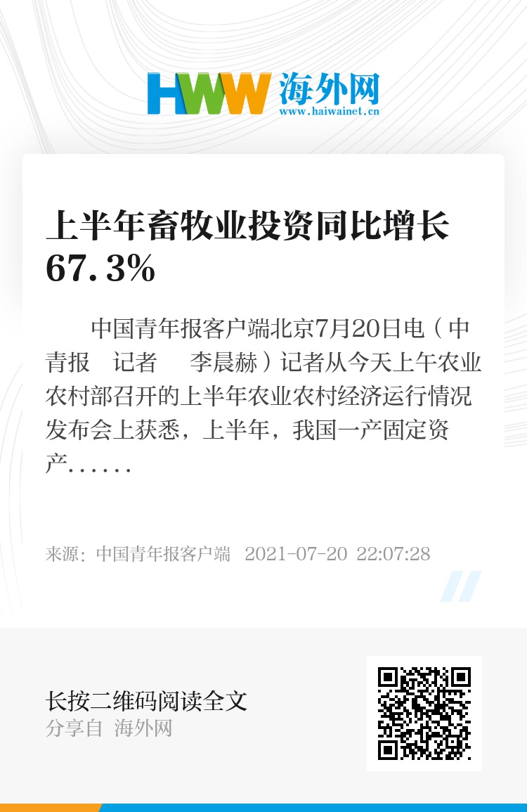 中国青年报客户端北京7月20日电(中青报・中青网记者 李晨赫)记者从今天上午农业农村部召开的上半年农业农村经济运行情况发布会上获悉,上半年,我国一产固定资产投资6564亿元,同比增长21.3%,两年平均增速13.2%,大幅高于二三产投资增速。