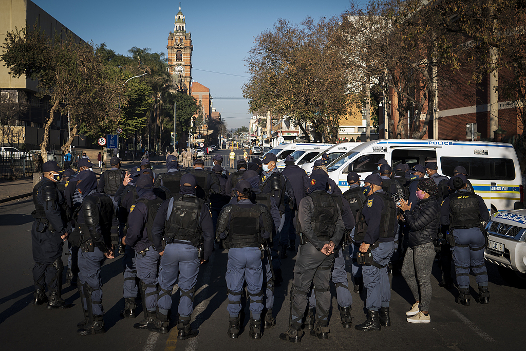 当地时间2021年7月19日,南非彼得马里茨堡,南非国防军士兵在治安和高等法院附近巡逻,南非前总统祖马涉贪腐案审理于当日恢复。19日的听证会以线上形式进行,目的是防止爆发抗议行动,但在法院四周依旧布置严格的警卫,因为此地此前曾聚集大量祖马支持者示威。图源:人民视觉
