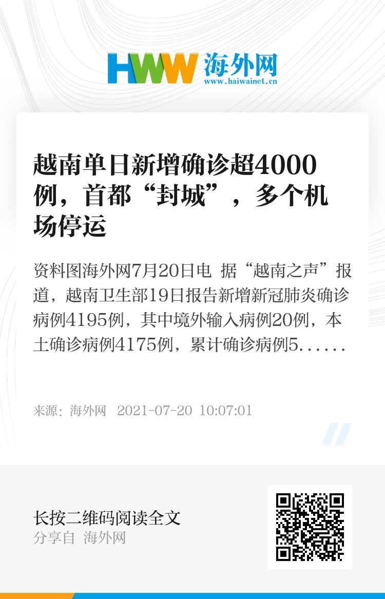海外网7月20日电 据“越南之声”报道,越南卫生部19日报告新增新冠肺炎确诊病例4195例,其中境外输入病例20例,本土确诊病例4175例,累计确诊病例58025例,累计死亡334人。