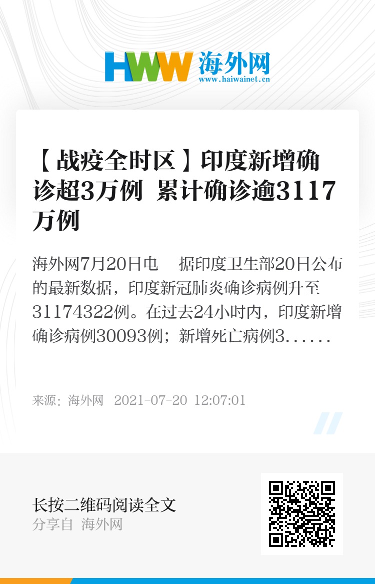 海外网7月20日电 据印度卫生部20日公布的最新数据,印度新冠肺炎确诊病例升至31174322例。在过去24小时内,印度新增确诊病例30093例;新增死亡病例374例,累计死亡病例414482例。(海外网 汪晓宇)