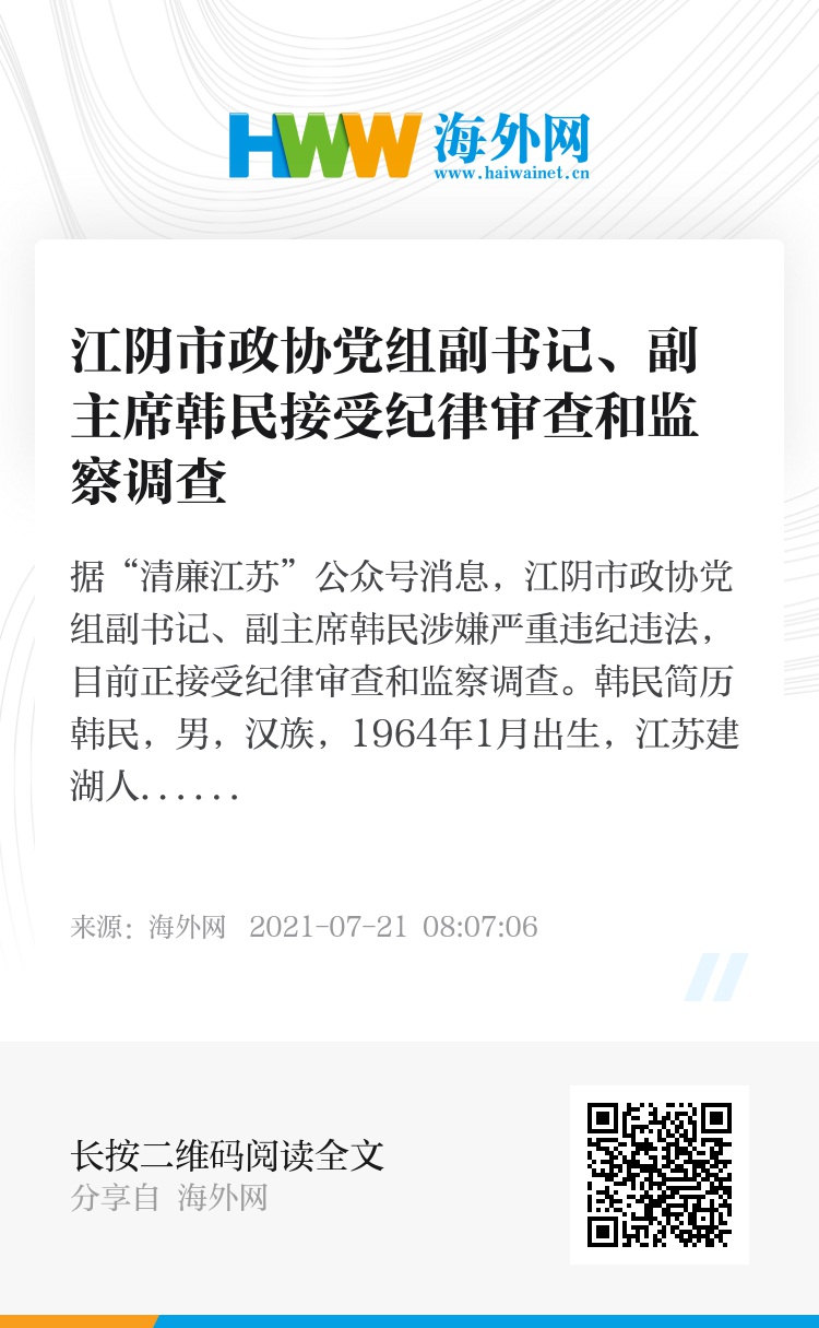 据“清廉江苏”公众号消息,江阴市政协党组副书记、副主席韩民涉嫌严重违纪违法,目前正接受纪律审查和监察调查。