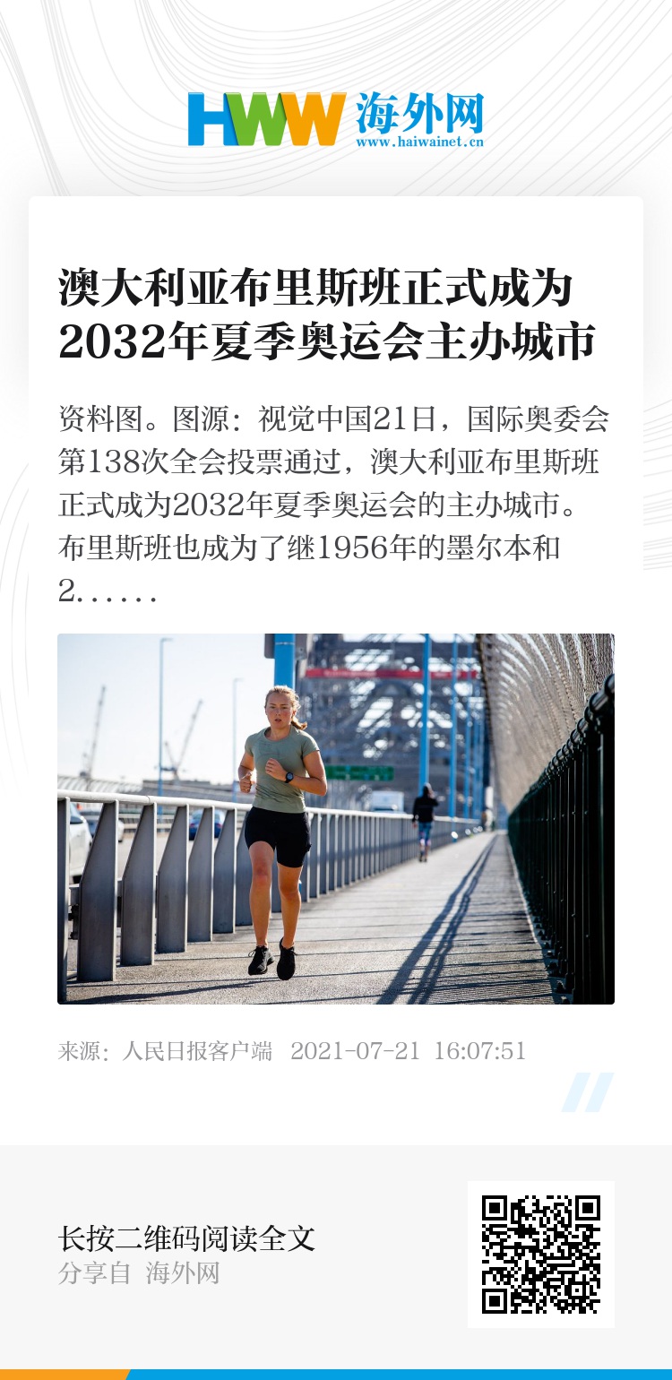 21日,国际奥委会第138次全会投票通过,澳大利亚布里斯班正式成为2032年夏季奥运会的主办城市。布里斯班也成为了继1956年的墨尔本和2000年的悉尼之后,第三座举办夏季奥运会的澳大利亚城市。
