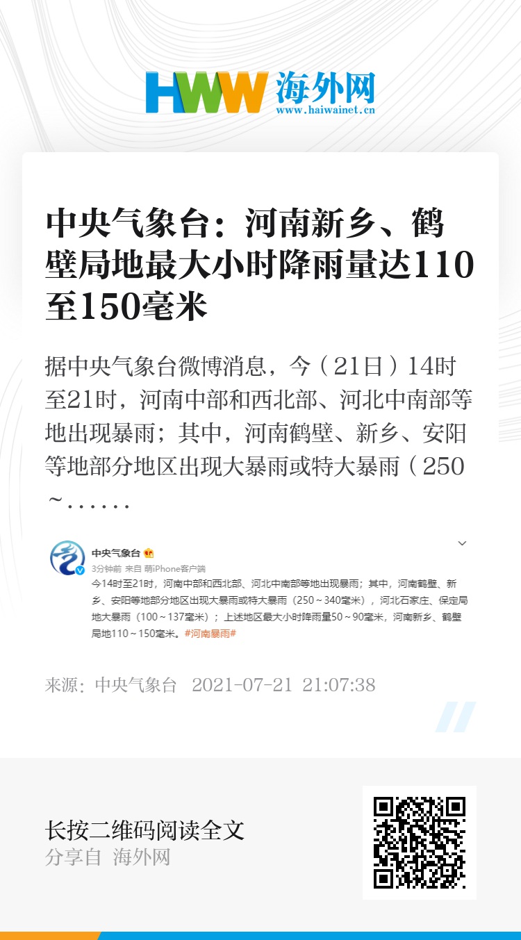据中央气象台微博消息,今(21日)14时至21时,河南中部和西北部、河北中南部等地出现暴雨;其中,河南鹤壁、新乡、安阳等地部分地区出现大暴雨或特大暴雨(250~340毫米),河北石家庄、保定局地大暴雨(100~137毫米);上述地区最大小时降雨量50~90毫米,河南新乡、鹤壁局地110~150毫米。