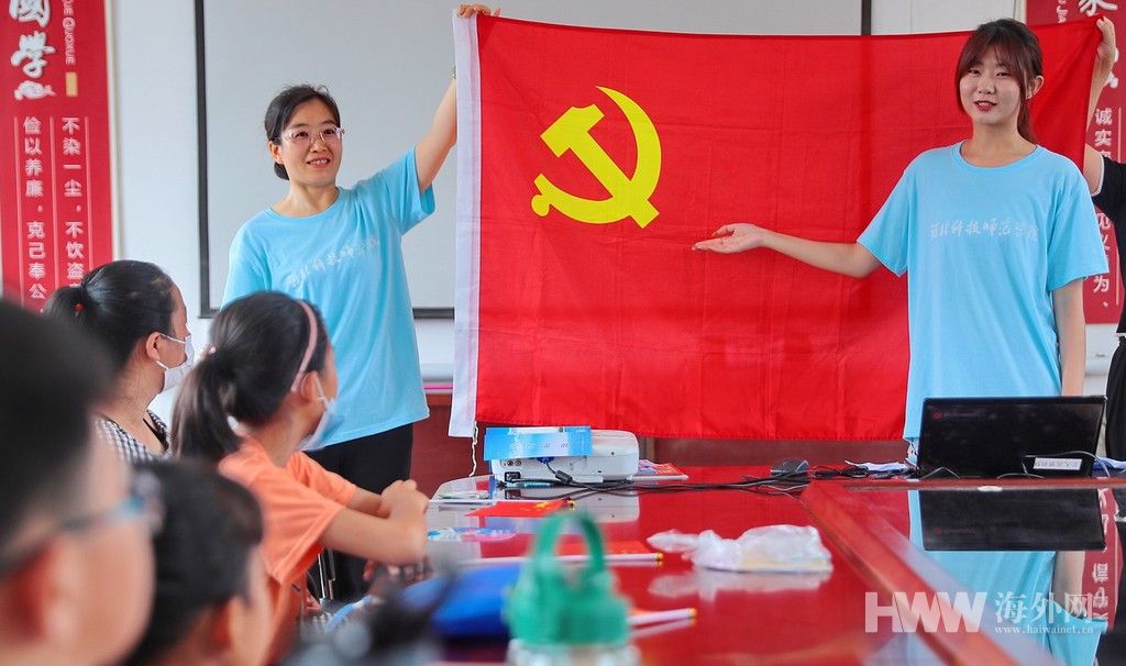 2021年7月21日,河北省秦皇岛市海港区河东街道工人北里社区联合河北科技师范学院开展“党史宣讲小课堂”活动。该校“青春里,心向党——红薪之声党史宣讲团”的大学生志愿者走进社区,为社区小朋友讲解红船精神、英雄小八路、长征、党徽等方面的红色小故事,普及党史学习教育知识,旨在将“传承红色基因"的党史学习融入日常教育生活,培养小朋友从小树立听党话,跟党走的信念。(供图:东方IC)