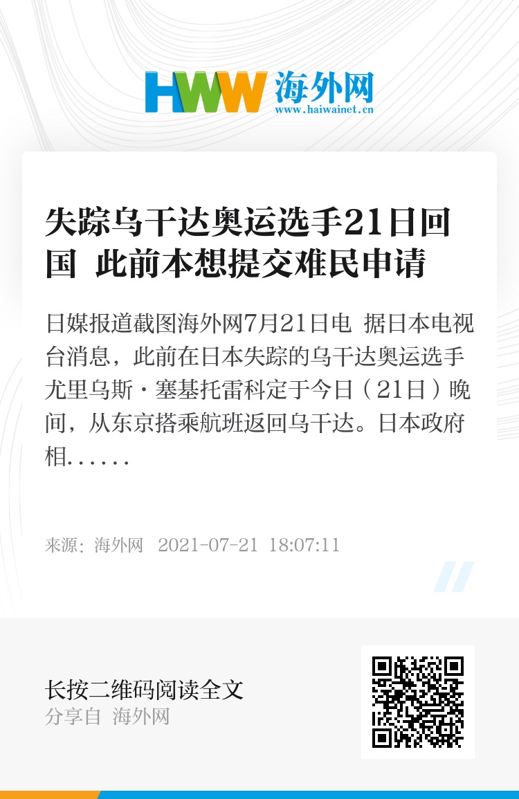 海外网7月21日电 据日本电视台消息,此前在日本失踪的乌干达奥运选手尤里乌斯·塞基托雷科定于今日(21日)晚间,从东京搭乘航班返回乌干达。
