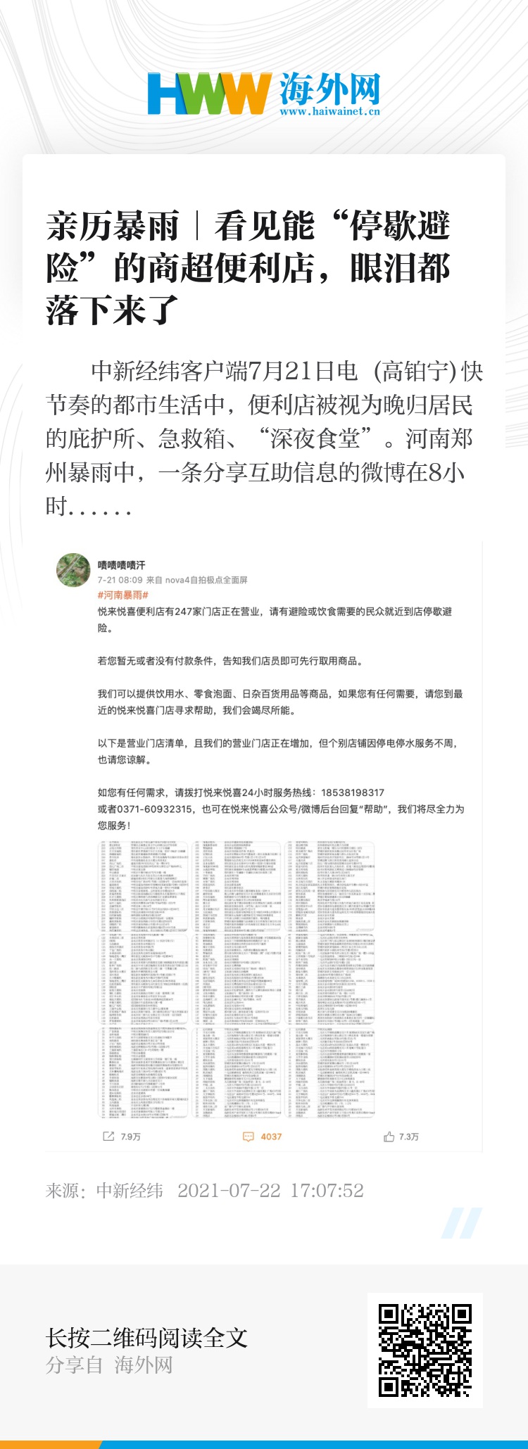 中新经纬客户端7月21日电 (高铂宁)快节奏的都市生活中,便利店被视为晚归居民的庇护所、急救箱、“深夜食堂”。河南郑州暴雨中,一条分享互助信息的微博在8小时内实现7.9万转发量,下面的经历,为转发了这条微博的你,补充更多守望相助的细节。