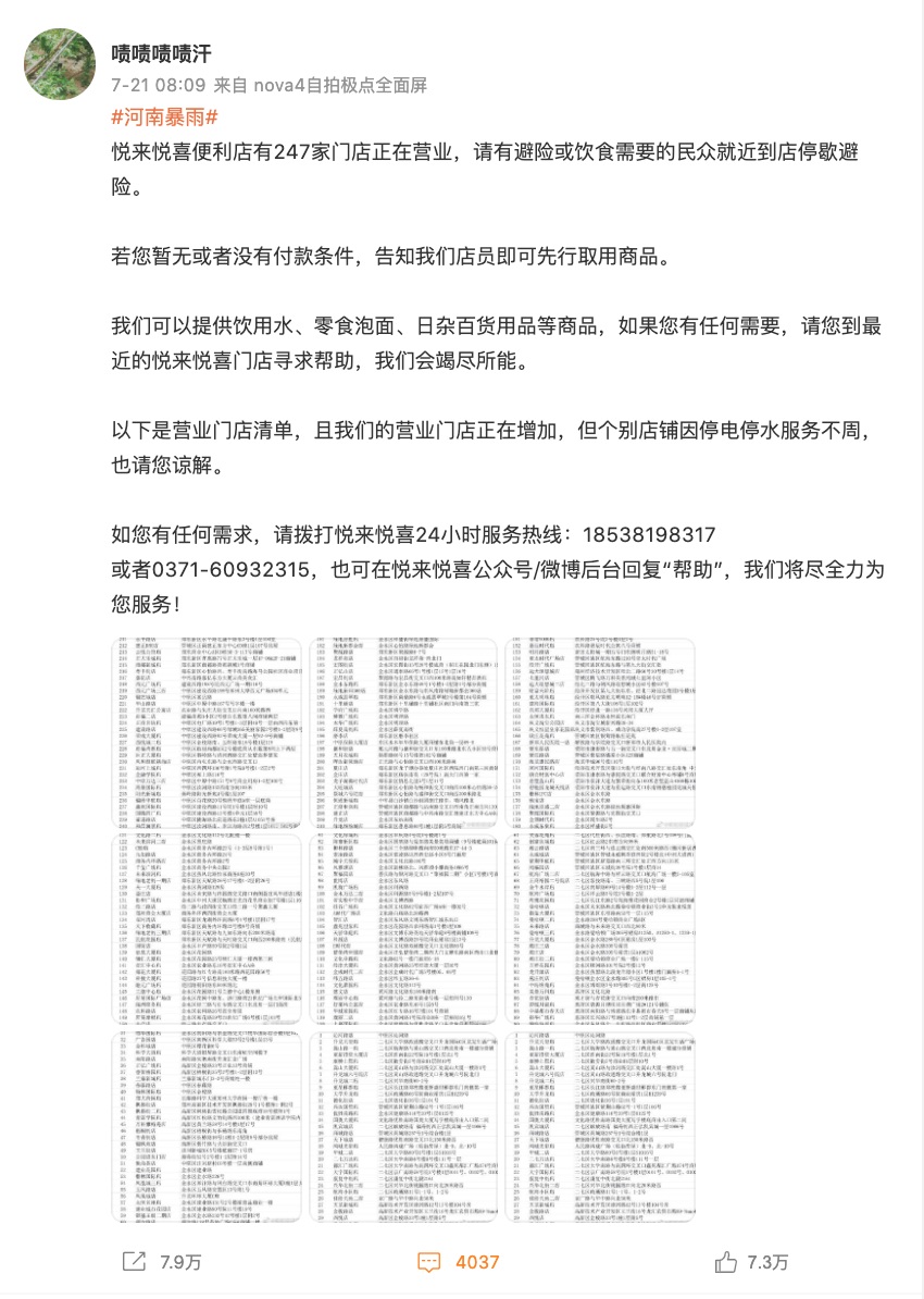 在微博转发评论区,类似的经历还有很多。一位微博网友评论称,“昨晚我公司楼下都停电停水,写字楼的人员去悦来悦喜买水和泡面拖鞋都没付款,但是都在一张纸上写了物品和名字和公司楼层。今天找到充电的地方,我去还钱,发现很多人已经打勾还过来了。”现居郑州的教育从业者小帆也与中新经纬分享了自己在郑州暴雨中的经历,小帆表示,由于昨晚停电,今天早上,只能带着电量用净的手机,搜罗出仅剩的现金,独自一人举着伞,踏上了上班的路。万幸,徒步在雨中走了几公里之后,看到一家悦来悦喜亮着灯,当时眼泪都落下来了,看到熟悉的蓝绿色牌子真的很感动。小帆说,除了感谢提供电源的商家,也要感谢一位谦让的陌生小哥,让我先给手机充电。