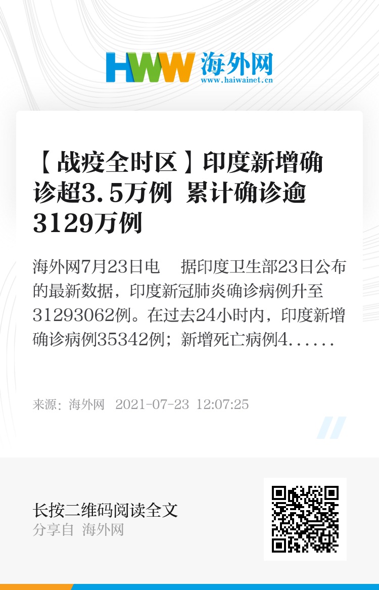 海外网7月23日电 据印度卫生部23日公布的最新数据,印度新冠肺炎确诊病例升至31293062例。在过去24小时内,印度新增确诊病例35342例;新增死亡病例483例,累计死亡病例419470例。(海外网 汪晓宇)
