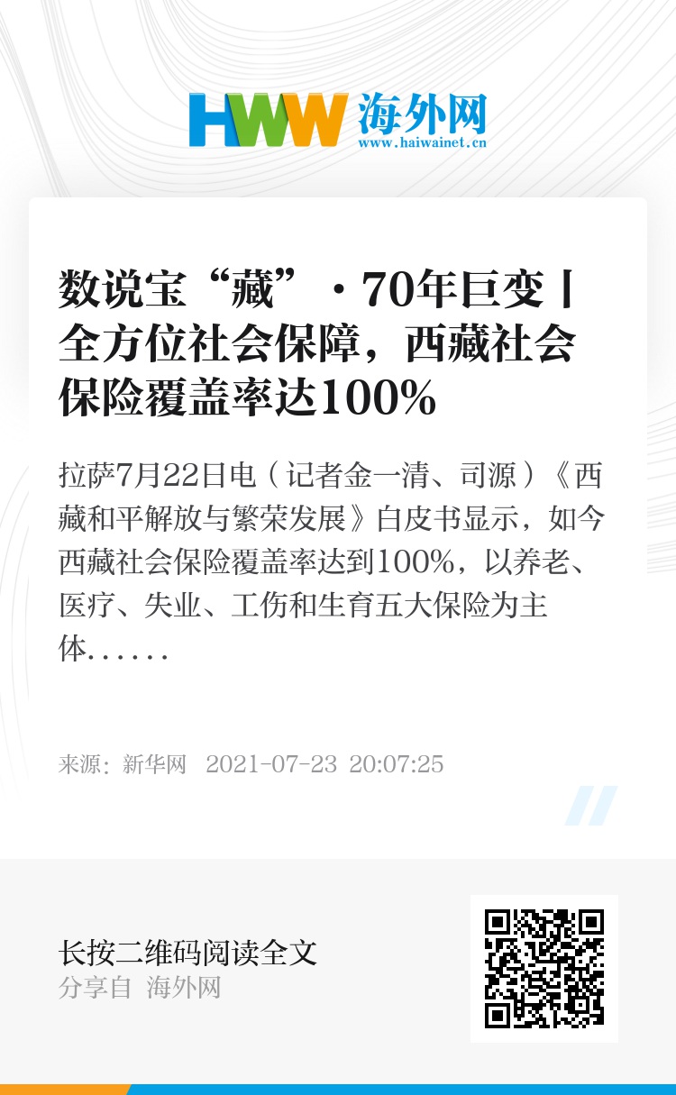 新华社拉萨7月22日电(记者金一清、司源)《西藏和平解放与繁荣发展》白皮书显示,如今西藏社会保险覆盖率达到100%,以养老、医疗、失业、工伤和生育五大保险为主体的覆盖城乡全体居民的社会保障体系全面建立,西藏各族人民群众生活得到有效保障。