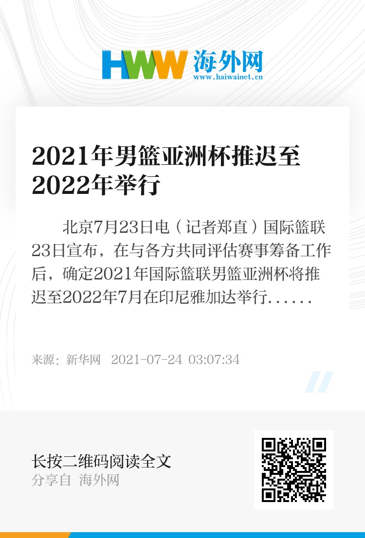 新华社北京7月23日电(记者郑直)国际篮联23日宣布,在与各方共同评估赛事筹备工作后,确定2021年国际篮联男篮亚洲杯将推迟至2022年7月在印尼雅加达举行,2021年国际篮联女篮亚洲杯第一级别比赛将于2021年9月27日至10月3日在约旦安曼举行。
