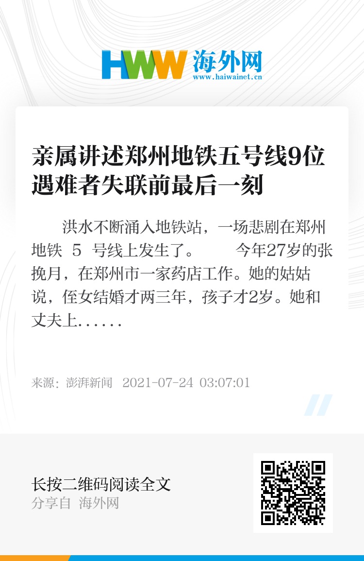 张挽月的姑姑告诉澎湃新闻(www.thepaper.cn),上了地铁后,张挽月原本和丈夫坐在一起,之后水就涨上来了,再后来他们在逃生过程中,水流越来越急,两个人就冲散了。之后就传来噩耗,张挽月不幸罹难。