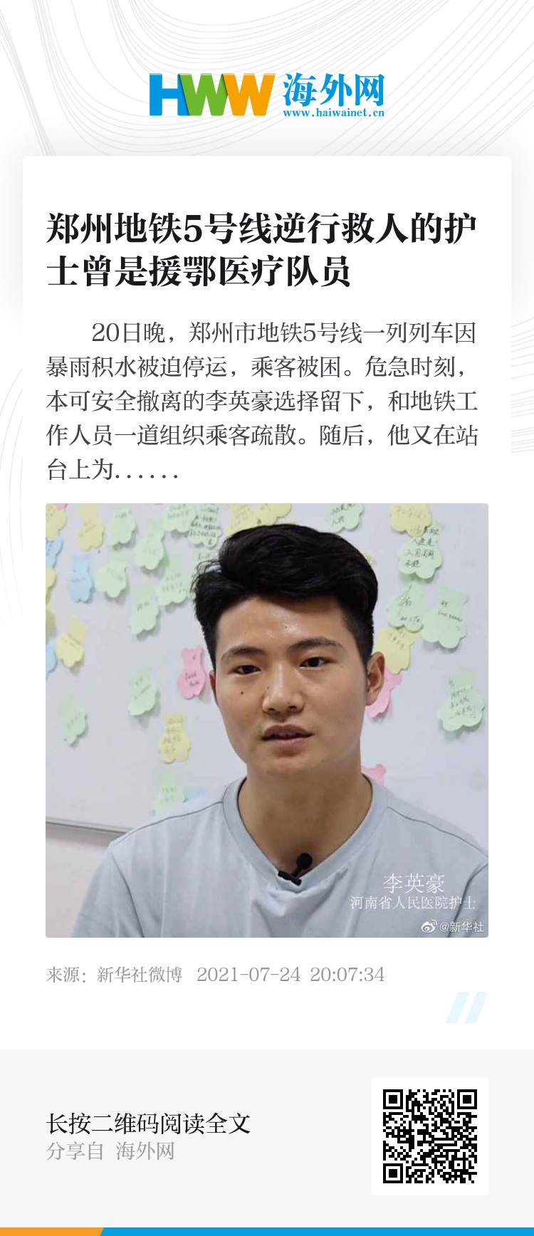 20日晚,郑州市地铁5号线一列列车因暴雨积水被迫停运,乘客被困。危急时刻,本可安全撤离的李英豪选择留下,和地铁工作人员一道组织乘客疏散。随后,他又在站台上为9人进行心肺复苏。这位心理强大的“90后”男孩是河南省人民医院的一名ICU护士,还曾是援鄂医疗队队员。(记者:任卓如、翟濯)
