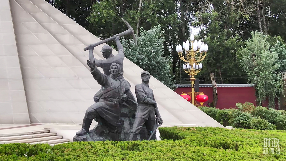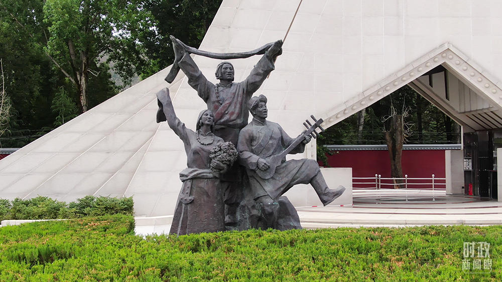 △纪念碑前方的两组青铜群雕,以西藏农奴翻身得解放和解放军筑路为主题。(总台记者李旭拍摄)