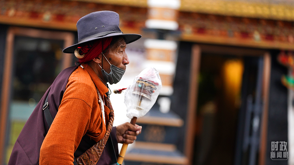 △拉萨八廓街上,手摇转经轮的行人走过。(总台国广记者李晋拍摄)