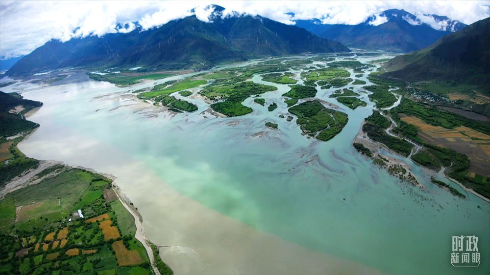 △雅鲁藏布江(左侧)与尼洋河(右侧)在此地交汇,两江合流呈现一清一浊、泾渭分明的景观。(总台记者康晓宇拍摄)