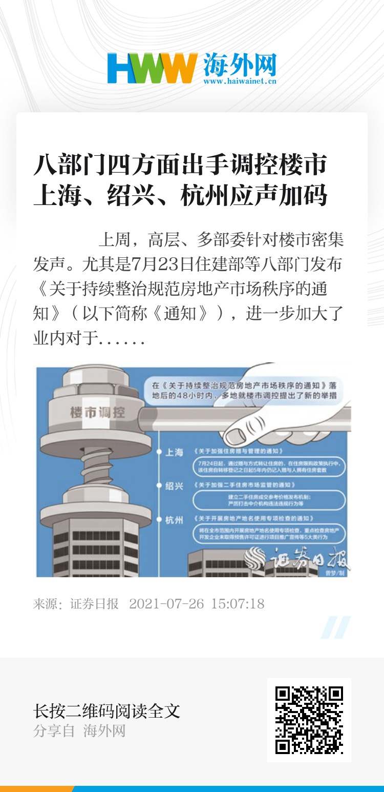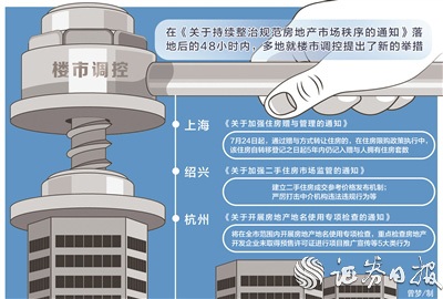 《证券日报》记者注意到,在《通知》落地后的48小时内,多地就楼市调控发布新的举措。其中,上海、绍兴、杭州于7月23日“应声”加码房地产市场调控政策。上海发布的《关于加强住房赠与管理的通知》提出,7月24日起,通过赠与方式转让住房的,在住房限购政策执行中,该住房自转移登记之日起5年内仍记入赠与人拥有住房套数;受赠人应符合国家和本市住房限购政策。绍兴发布的《关于加强二手住房市场监管的通知》则提出,建立二手住房成交参考价格发布机制;落实二手住房成交参考价格在金融信贷等应用;严厉打击中介机构违法违规行为等。杭州则在《关于开展房地产地名使用专项检查的通知》中明确,将于7月25日至9月30日在全市范围内开展房地产地名使用专项检查,重点检查房地产开发企业未取得预售许可证进行项目推广宣传等5大类行为,营造健康有序的房地产市场环境,规范地名使用管理,保护购房者合法权益。