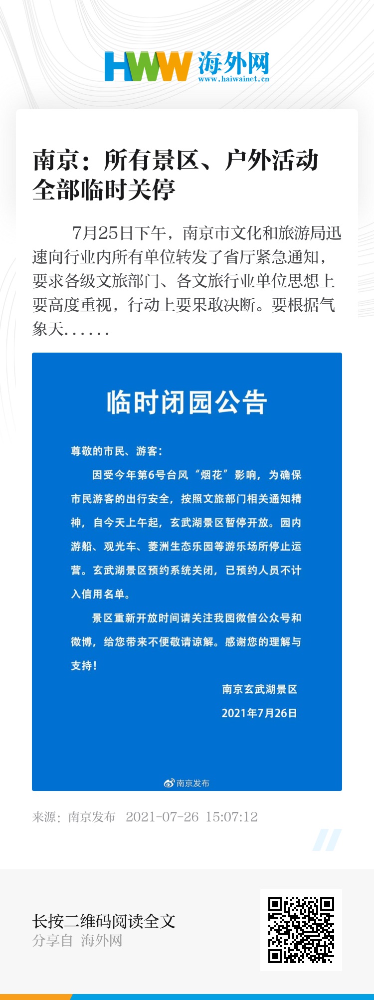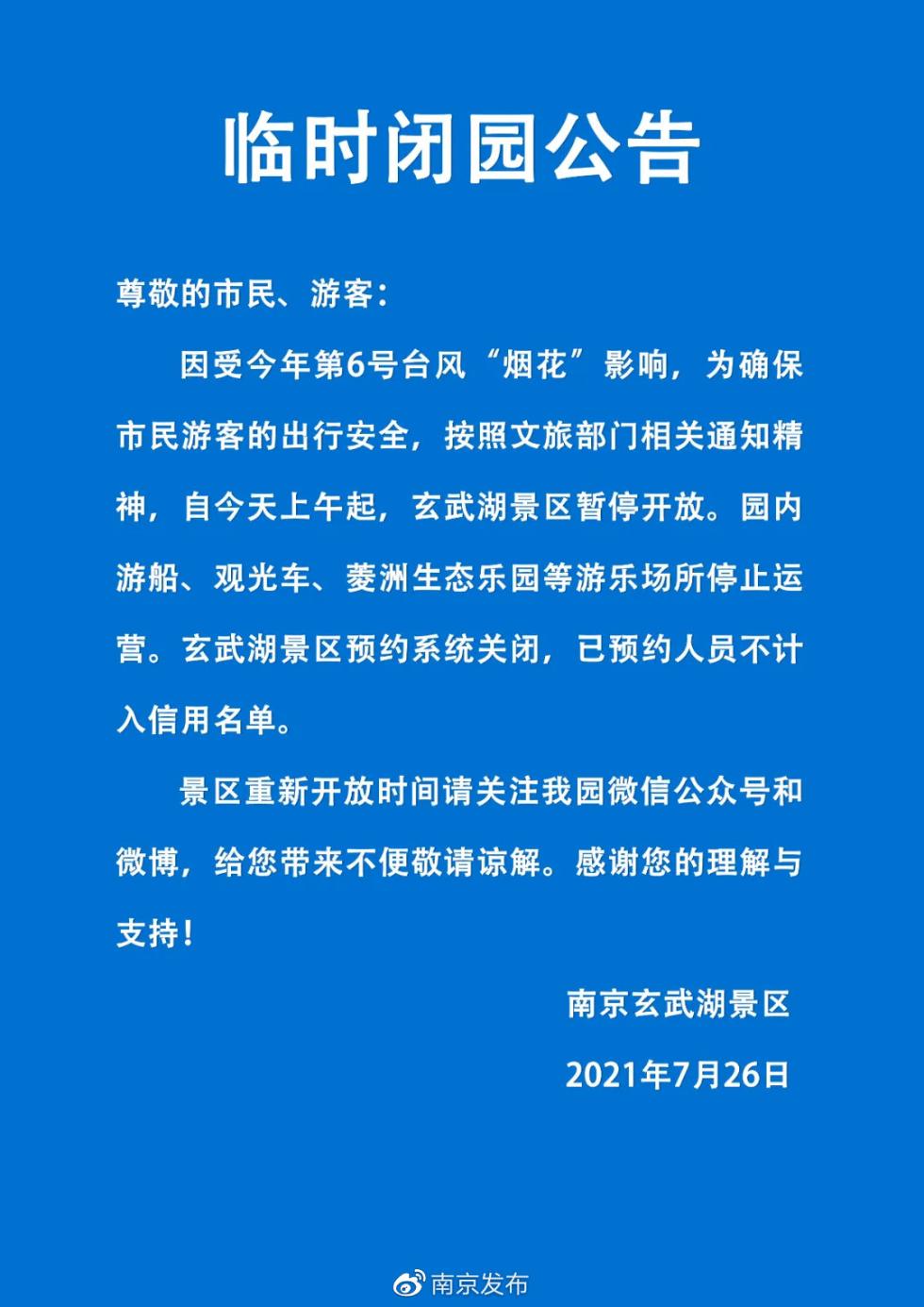 因受台风“烟花”的影响,为确保游客出行安全,接上级文旅部门通知,自2021年7月26日起,钟山风景区所属的中山陵、明孝陵、灵谷景区,音乐台、美龄宫、白马公园等景点,以及明孝陵博物馆、孙中山纪念馆、南京抗日航空烈士纪念馆等文博场馆均暂停开放。紫金山索道、区内电瓶车等设施停运。中山陵预约系统关闭,已预约游客不计入信用名单。各网络销售票按原渠道退回。 景区开放时间另行通知,给您带来的不便敬请谅解。恳请相互告知。