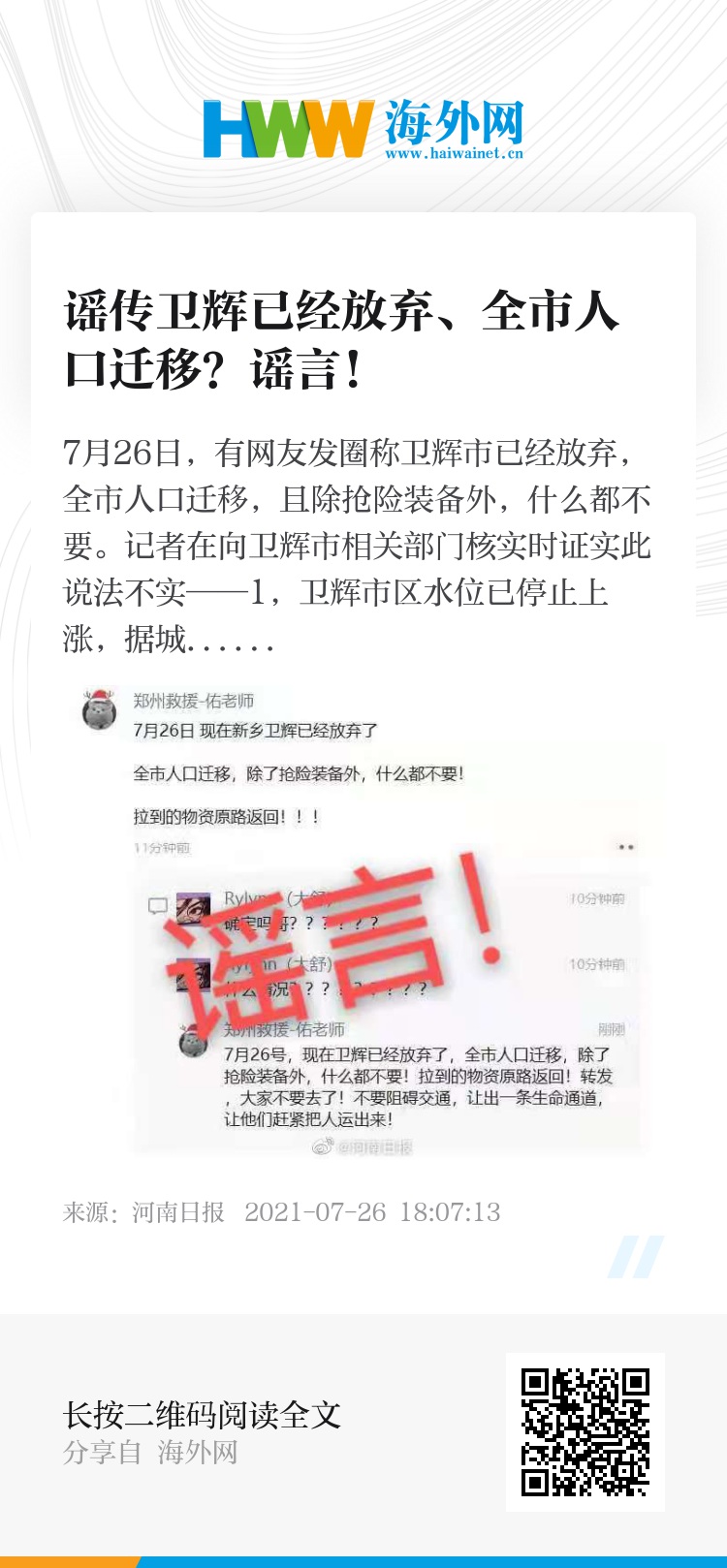 7月26日,有网友发圈称卫辉市已经放弃,全市人口迁移,且除抢险装备外,什么都不要。记者在向卫辉市相关部门核实时证实此说法不实——