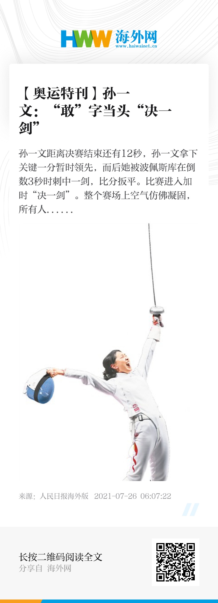7月24日晚,女子个人重剑决赛场上,29岁的中国队选手孙一文在“决一剑”中击败罗马尼亚队选手波佩斯库,获得东京奥运会女子重剑冠军。这也是中国击剑队在奥运会历史上的首枚女子重剑个人金牌。