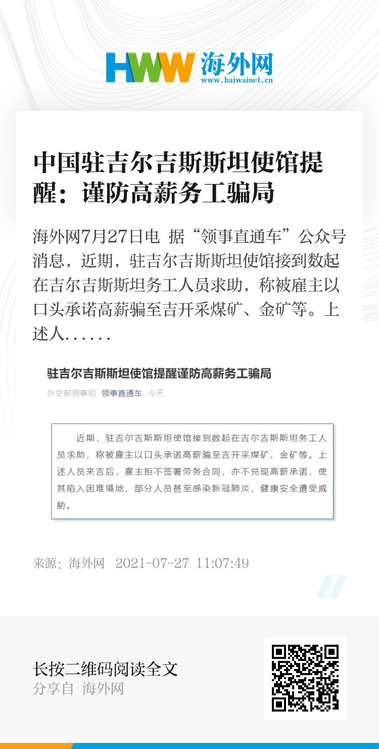 海外网7月27日电 据“领事直通车”公众号消息,近期,驻吉尔吉斯斯坦使馆接到数起在吉尔吉斯斯坦务工人员求助,称被雇主以口头承诺高薪骗至吉开采煤矿、金矿等。上述人员来吉后,雇主拒不签署劳务合同,亦不兑现高薪承诺,使其陷入困难境地,部分人员甚至感染新冠肺炎,健康安全遭受威胁。