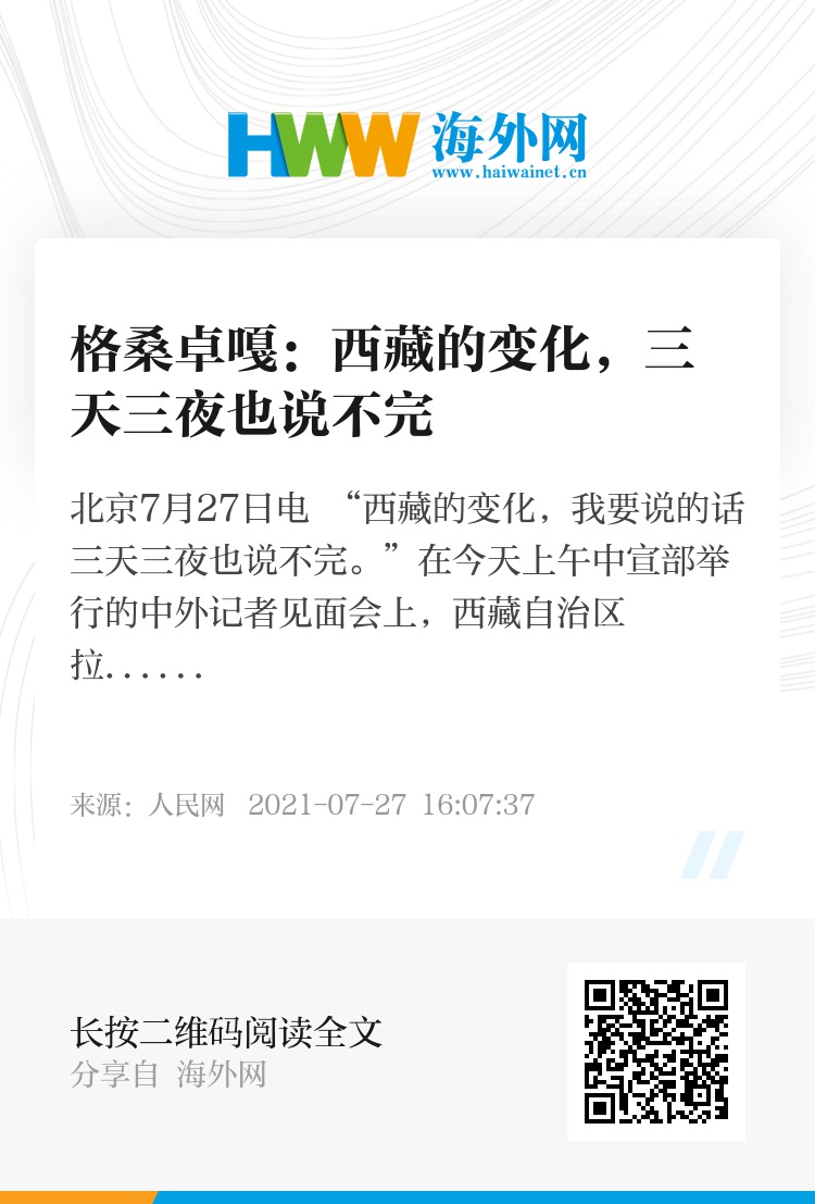 人民网北京7月27日电 “西藏的变化,我要说的话三天三夜也说不完。”在今天上午中宣部举行的中外记者见面会上,西藏自治区拉萨市城关区纳金街道塔玛村原第一书记格桑卓嘎说。