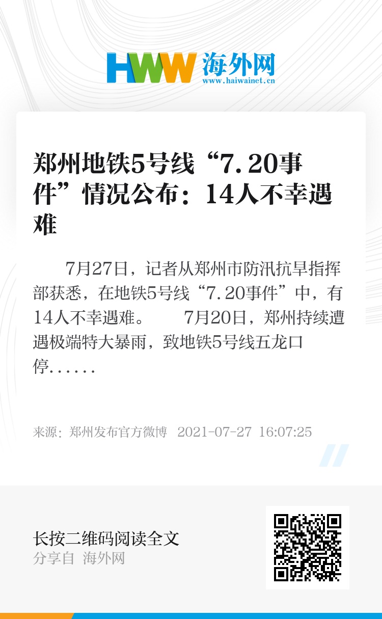 7月27日,记者从郑州市防汛抗旱指挥部获悉,在地铁5号线“7.20事件”中,有14人不幸遇难。