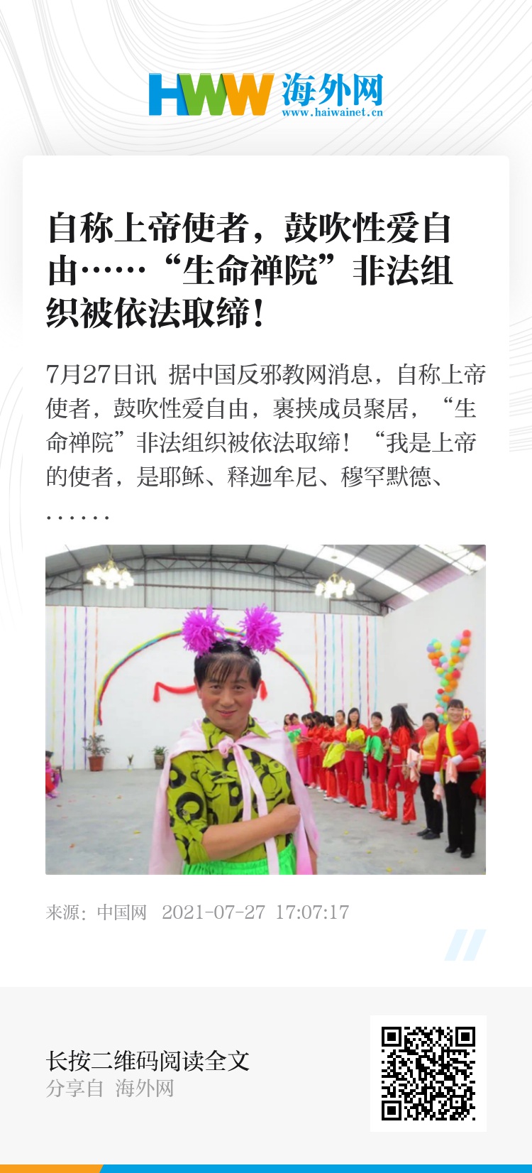 中国网7月27日讯 据中国反邪教网消息,自称上帝使者,鼓吹性爱自由,裹挟成员聚居,“生命禅院”非法组织被依法取缔!