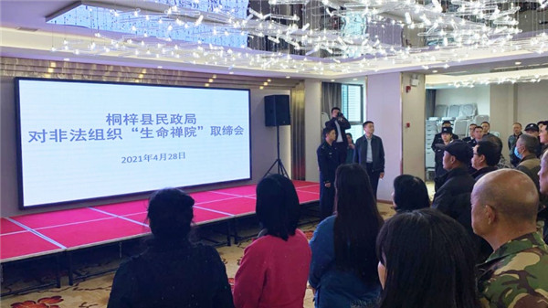 因“生命禅院”非法组织未经登记、备案,擅自以社会团体名义开展活动,桐梓、安龙两县民政部门依据《社会团体登记管理条例》《取缔非法民间组织暂行办法》的有关规定,对其依法取缔,并于4月28日下午、29日上午分别向窝点内成员宣读了取缔决定书。之后,各地公安机关及有关部门工作人员分批次将被裹挟人员带回原籍,与家人团聚。
